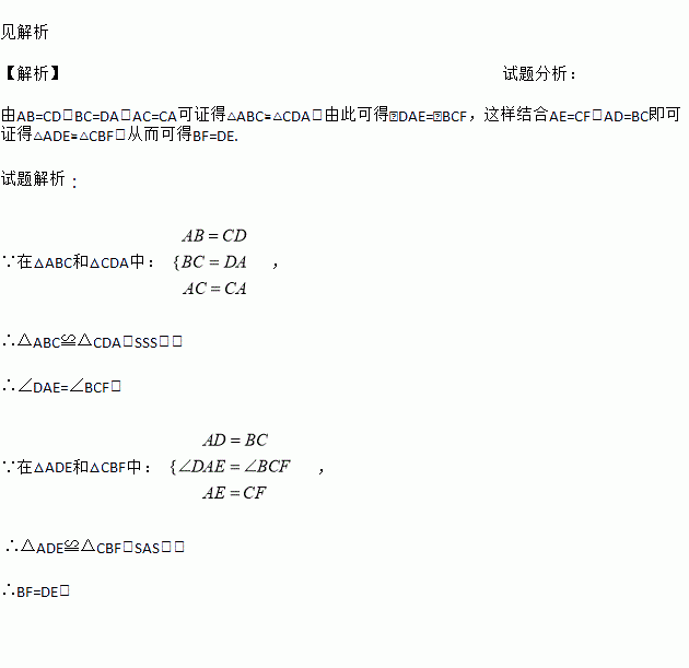 如图所示,AB=CD,BC=DA,E,F是AC上的两点,且AE=CF,求证:BF=DE.