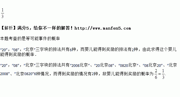 有一对酷爱运动的年轻夫妇给他们12个月大的婴儿拼排3块分别写有“20”,“08"和“北京”的字块,如果婴儿能够排成"2008北京”或者“北京2008".则他们就给婴儿奖励,假设婴儿能将字块横着正排,那么这个婴儿能得到奖励的概率是___________.