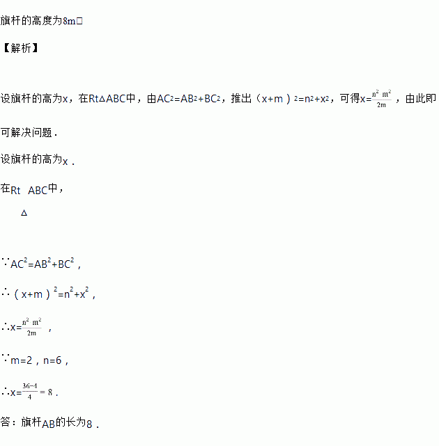 如图,数学兴趣小组要测量旗杆的高度,同学们发现系在旗杆顶端的绳子垂到地面并多出一段(如图1),聪明的小红发现:先测出垂到地面的绳子长m,再将绳子拉直(如图2),测出绳子末端C到旗杆底部B的距离n,利用所学知识就能求出旗杆的长,若m=2,n=6,求旗杆AB的长.