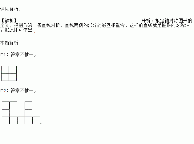 详见解析. 【解析】分析:根据轴对称图形的定义,把图形沿一条直线对折,直线两侧的部分能够互相重合,这样的直线就是图形的对称轴,据此即可作出. 本题解析: (1)答案不惟一, (2)答案不惟一,