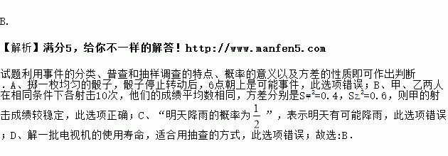 B.甲、乙两人在相同条件下各射击10次,他们的成绩平均数相同,方差分别是