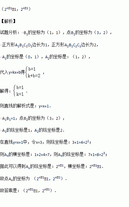 在直角坐标系中,正方形A1B1C1O1、A2B2C2C1、…、AnBnCnCn﹣1按如图所示的方式放置,其中点A1、A2、A3、…、An均在一次函数y=kx+b的图象上,点C1、C2、C3、…、Cn均在x轴上.若点B1的坐标为(1,1),点B2的坐标为(3,2),则点An的坐标为 .