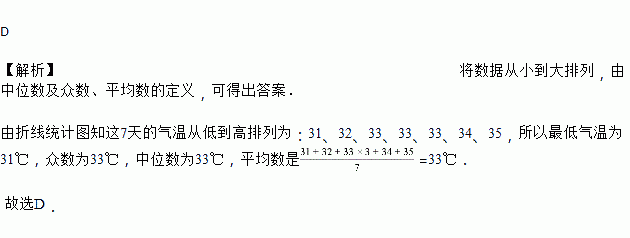 A. 最低温度是32℃ B. 众数是35℃ C. 中位数是34℃ D. 平均数是33℃