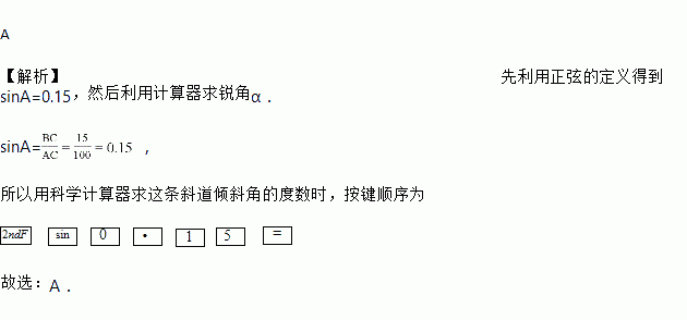 (题文)一辆小车沿着如图所示的斜坡向上行驶了100米,其铅直高度上升了15米.在用科学计算器求坡角α的度数时,具体按键顺序是( )