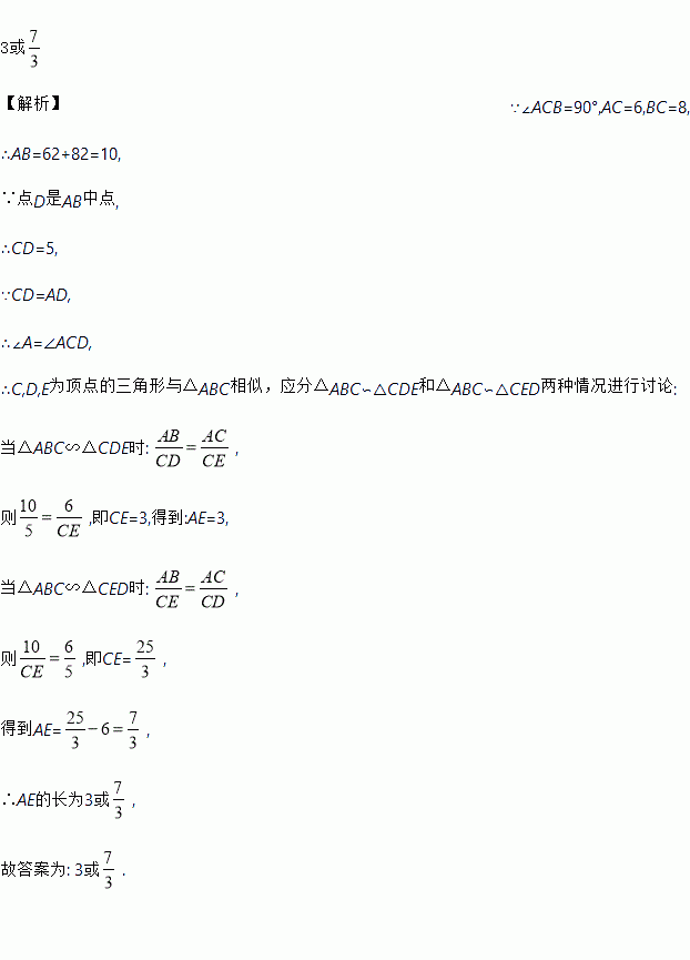 3或 【解析】∵∠ACB=90°,AC=6,BC=8, ∴AB=62+82=10, ∵点D是AB中点, ∴CD=5, ∵CD=AD, ∴∠A=∠ACD, ∴C,D,E为顶点的三角形与△ABC相似,应分△ABC∽△CDE和△ABC∽△CED两种情况进行讨论: 当△ABC∽△CDE时: , 则,即CE=3,得到:AE=3, 当△ABC∽△CE...