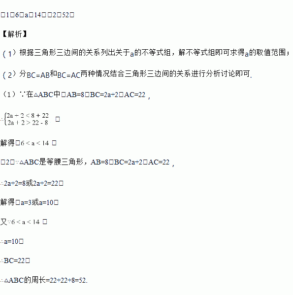 在△ABC中,AB=8,BC=2a+2,AC=22.