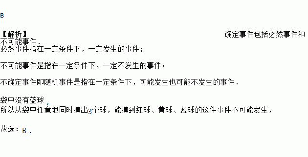 一个不透明的袋中有形状和大小完全一样的8个小球,其中4个红色,2个黄色,2个白色,从袋中任意地同时摸出3个球,能摸到红球、黄球、蓝球的这件事件( )