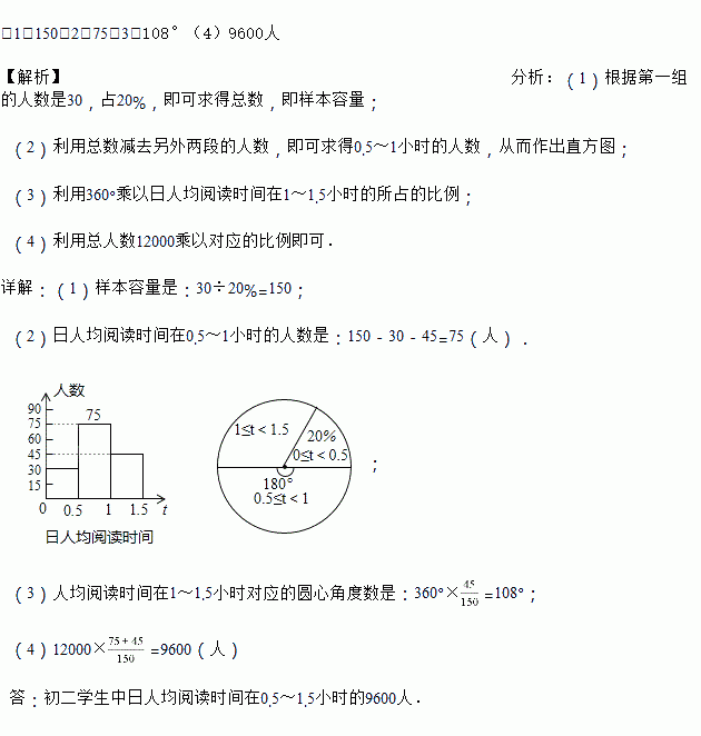 (4)根据本次抽样调查,试估计我市12000名初二学生中日人均阅读时间在0.5~1.5小时的多少人.