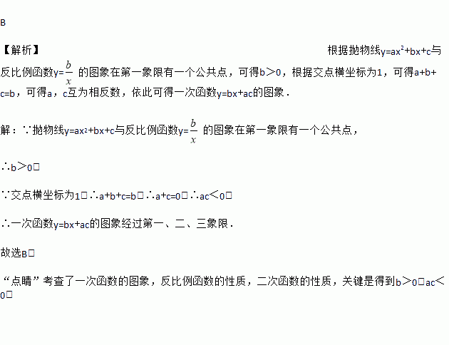 已知抛物线与反比例函数的图像在第一象限有一个公共点,其横坐标为1,则一次函数的图像可能是( )