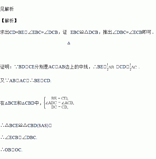 如图,在△ABC中,AB=AC,△ABC的两条中线BD、CE交于O点,求证:OB=OC.