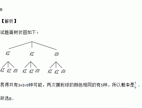 不透明的袋子里装有2个红球和1个白球,这些球除了颜色外其他都相同.从中任意摸出一个球,记下颜色后,放回摇匀,再从中摸出一个,则两次摸到球的颜色相同的概率是( )