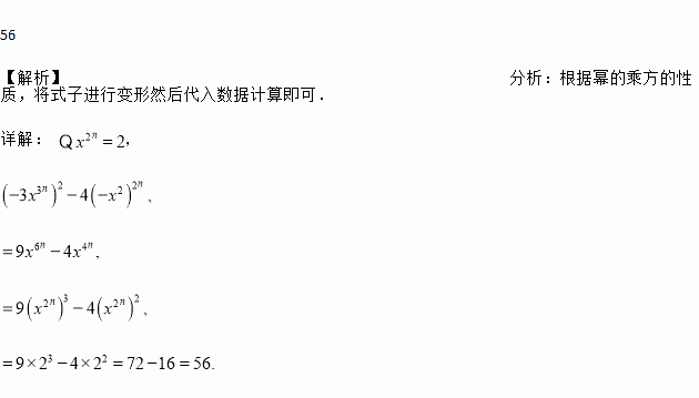 若n为正整数,且x2n=2,试求(-3x3n)2-4(-x2)2n的值.