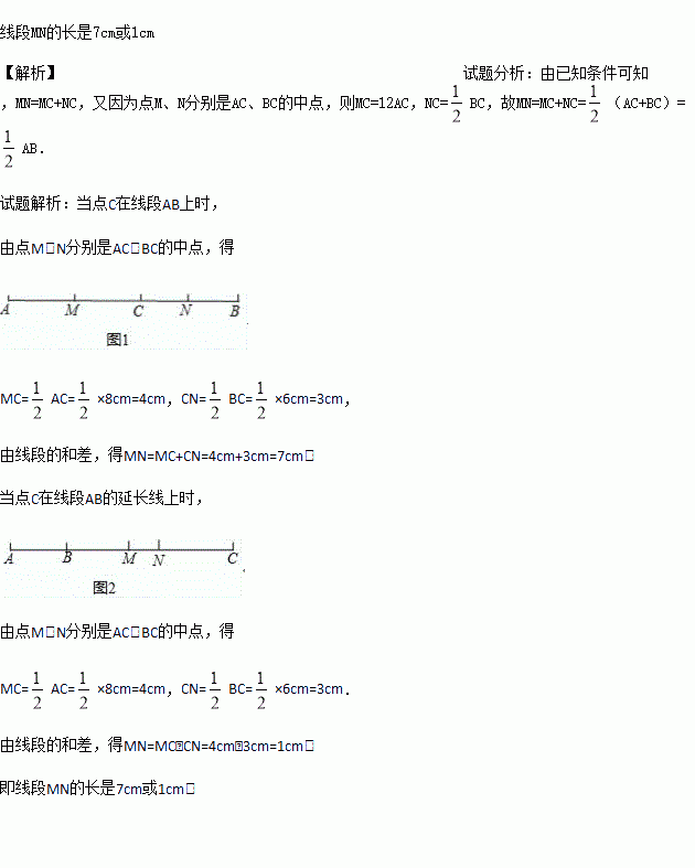 已知:点C在直线AB上,AC=8cm,BC=6cm,点M、N分别是AC、BC的中点,求线段MN的长.