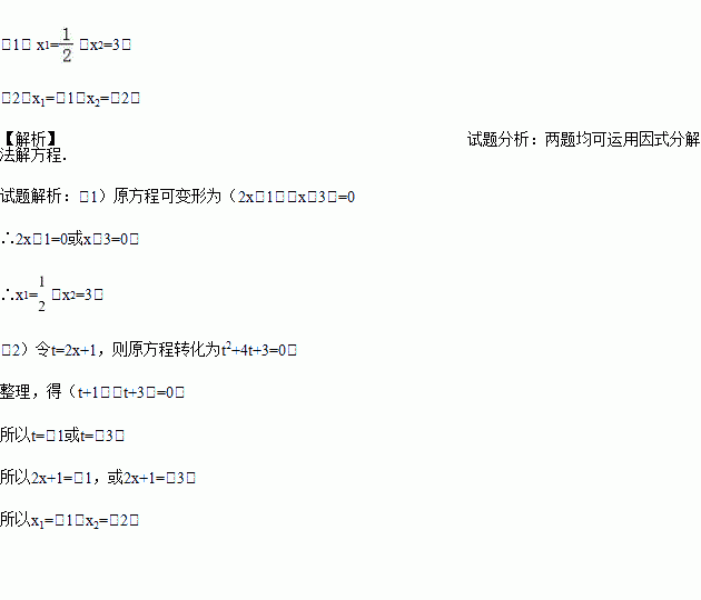 (1)解方程:2x2+3=7x; (2)解方程:(2x+1)2+4(2x+1)+3=0.