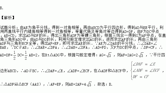 Èçͼ£¬ÔÚÆ½ÐÐËıßÐÎABCDÖУ¬AB=4£¬¡ÏBADµÄƽ·ÖÏßÓëBCµÄÑÓ³¤Ïß½»ÓÚµãE£¬ÓëDC½»ÓÚµãF£¬ÇÒµãFΪ±ßDCµÄÖе㣬DG¡ÍAE£¬´¹×ãΪG£¬ÈôDG=1£¬ÔòAEµÄ±ß³¤Îª£¨ £©.