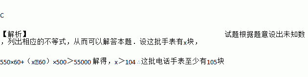 某经销商销售一批电话手表,第一个月以550元/块的价格售出60块,第二个月起降价,以500元/块的价格将这批电话手表全部售出,销售总额超过了5.5万元.这批电话手表至少有( )
