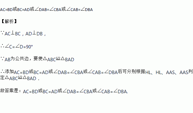 (题文)如图,AC⊥BC,AD⊥DB,要使△ABC≌△BAD,还需添加条件_____.(只需写出符合条件一种情况)