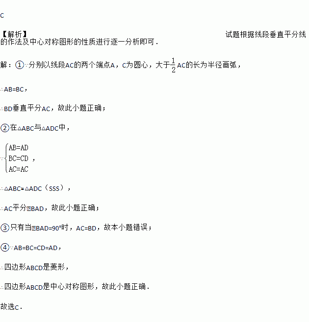 AC的长为半径画弧,两弧相交于B,D两点,连接BD,AB,BC,CD,DA,以下结论: