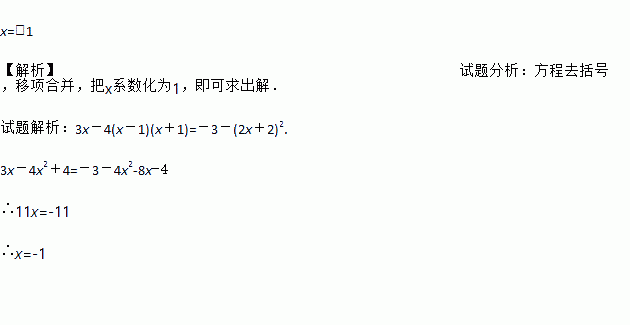 x=-1 【解析】试题分析:方程去括号,移项合并,把x系数化为1,即可求出解. 试题解析:3x-4(x-1)(x+1)=-3-(2x+2)2. 3x-4x2+4=-3-4x2-8x-4 ∴11x=-11 ∴x=-1