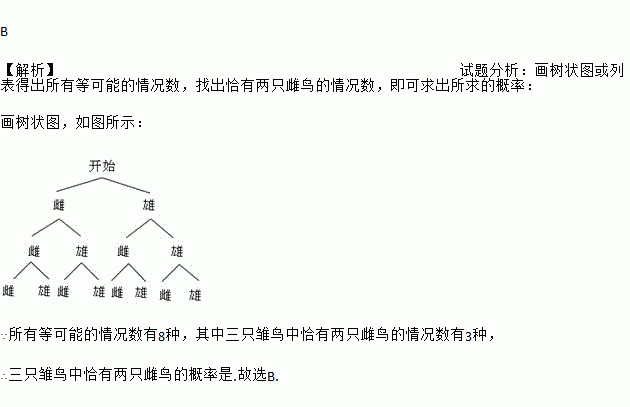 假定鸟蛋孵化后,雏鸟为雌与雄时概率相同,如果三枚蛋全部成功孵化,则三只雏鸟中恰有两只雄鸟的概率是( )