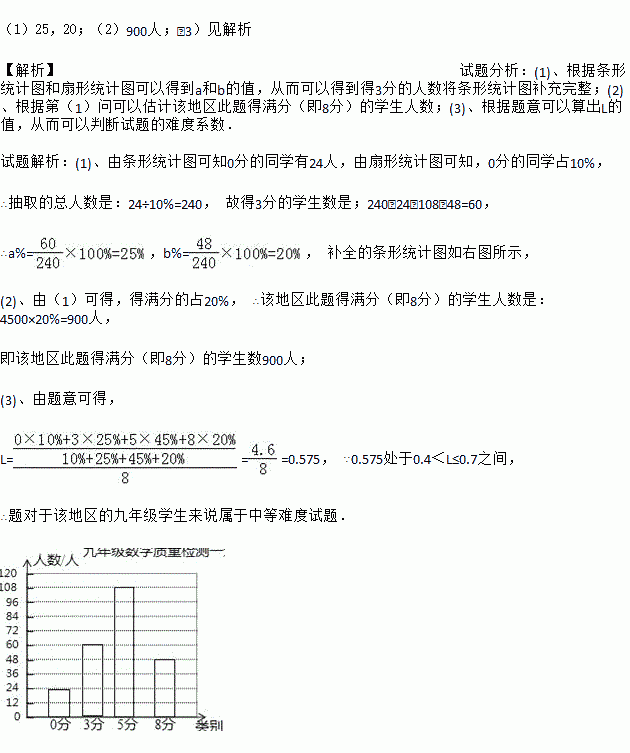 某地区在一次九年级数学做了检测中,有一道满分8分的解答题,按评分标准,所有考生的得分只有四种:0分,3分,5分,8分.老师为了了解学生的得分情况与题目的难易情况,从全区4500名考生的试卷中随机抽取一部分,通过分析与整理,绘制了如下两幅图不完整的统计图.