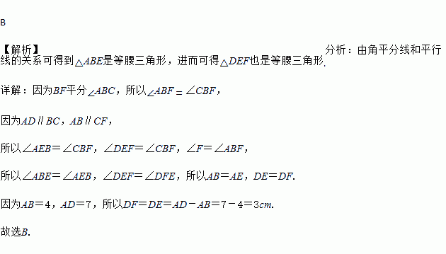 如图,在?ABCD中,AB=4cm,AD=7cm,∠ABC平分线交AD于E,交CD的延长线于点F,则DF=( )