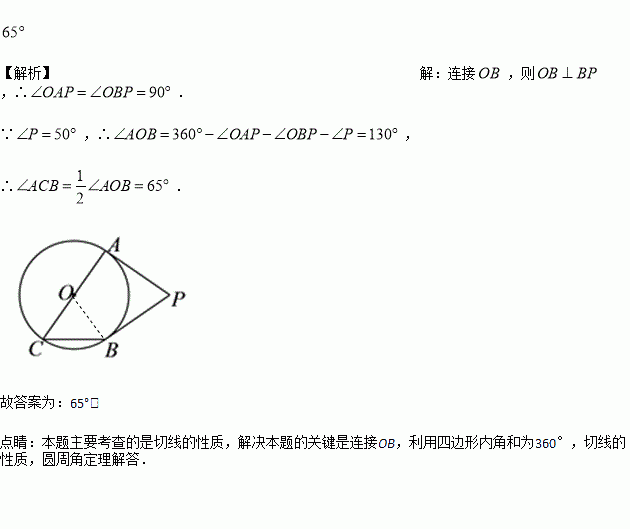 如图, 、是⊙的切线,切点分别为、, 是⊙的直径, ,则 __________.
