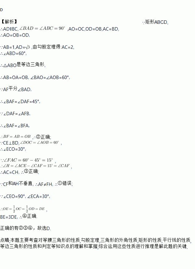,AF平分∠DAB,过C点作CE⊥BD于E,延长AF.EC交于点H,下列结论中:①AF=FH;②BO=BF;③CA=CH;④BE=3ED.正确的是( )
