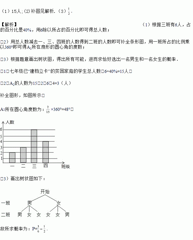 当前,精准扶贫工作已进入攻坚阶段,凡贫困家庭均要“建档立卡”.某中学七年级共有四个班,已“建档立卡”的贫困家庭的学生人数按一、二、三、四班分别记为A1,A2,A3,A4,现对A1,A2,A3,A4统计后,制成如图所示的统计图.