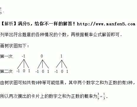 一个不透明的口袋中装有三张卡片,上面分别标有数字﹣1,0,1,每张卡片除数字不同外其余均相同,文博同学从口袋中随机摸出一张卡片,记下数字后放回并搅匀;再从口袋中随机摸出一张卡片记下数字.用画树状图(或列表)的方法,求文博同学两次摸出的卡片上的数字之和为正数的概率.