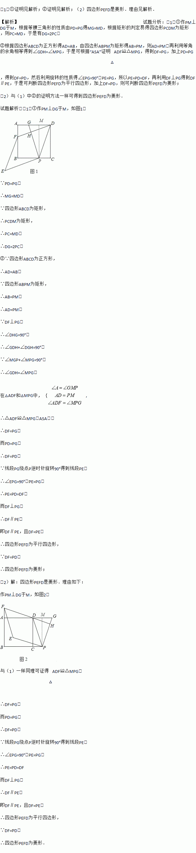 (2)如图2,当点P与点G分别在线段BC与线段AD的延长线上时,请猜想四边形PEFD是怎样的特殊四边形,并证明你的猜想.