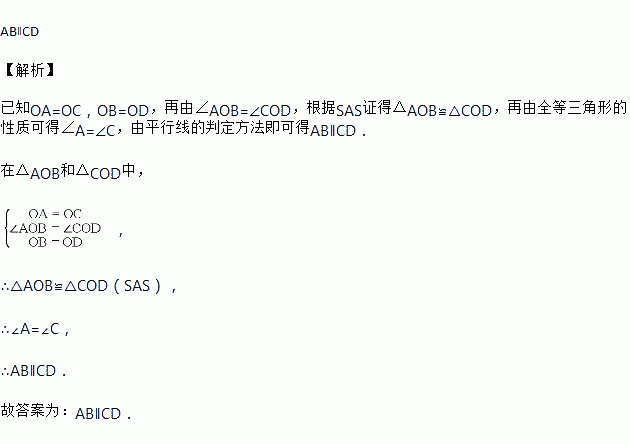 如图,线段AC、BD相交于点0,OA=OC,OB=OD,那么AB、CD的位置关系是_____.