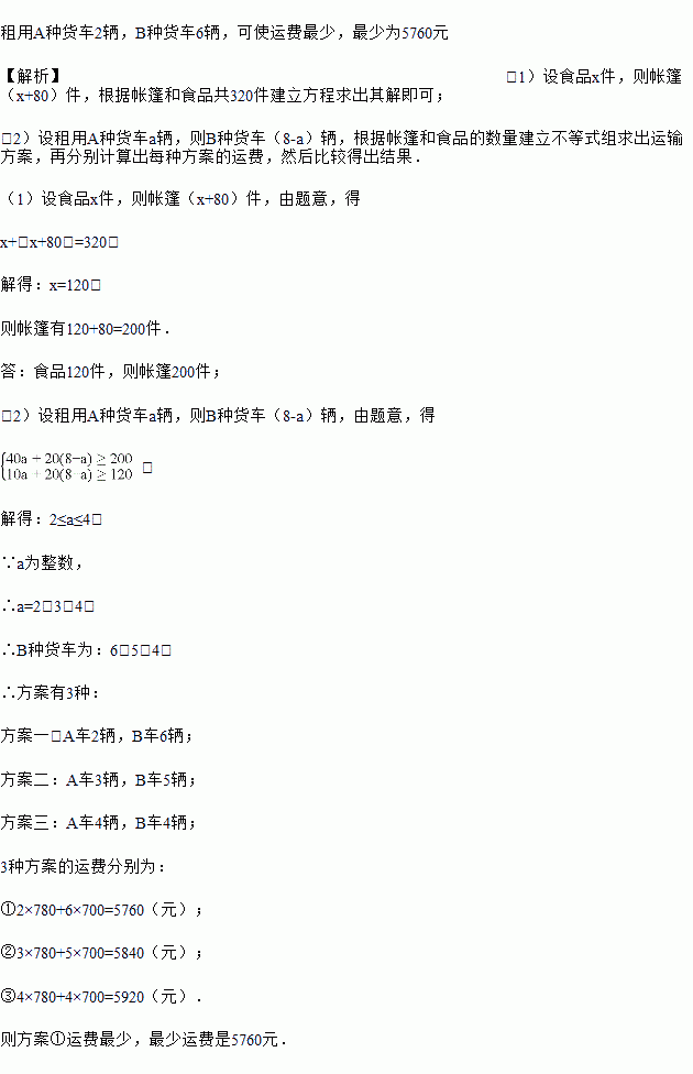 (2)现计划租用A、B两种货车共8辆,一次性将这批物资全部送到灾民手中,已知两种货车可装帐篷和食品的件数以及每辆货车所需付运费情况如下表,求出运费最少的方案?最少运费是多少?