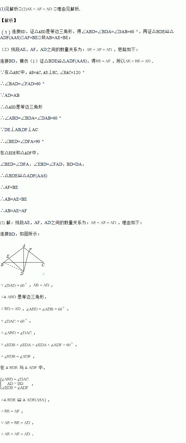 (2)如图2,如果∠EDF=60?,且∠EDF两边分别交边AB,AC于点E,F,那么线段AE,AF,AD之间有怎样的数量关系?并给出证明.