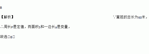 B 【解析】∵篱笆的总长为60米, ∴周长P是定值,而面积S和一边长a是变量, 故选:B.