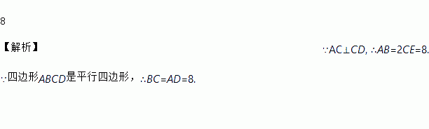如图,在口ABCD中, , E是AD的中点,若CE=4,则BC的长是_______________.