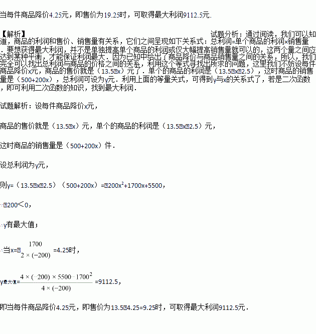 某商店销售一种商品,每件的进价为2.50元,根据市场调查,销售量与销售单价满足如下关系:在一段时间内,单价是13.50元时,销售量为500件,而单价每降低1元,就可以多售出200件.请你分析,销售单价多少时,可以获利最大.