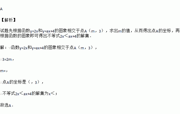 如图,函数 y=2x 和 y=ax+4 的图象相交于点 A(m,3),则不等式 2x<ax+4的解集为( )