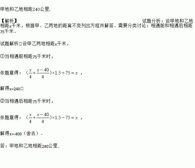 甲地和乙地相距240公里. 【解析】试题分析:设甲地和乙地相距x千米,根据甲、乙两地的距离不变列出方程并解答.需要分类讨论:相遇前和相遇后相距75千米. 试题解析:设甲乙两地相距x千米, ①当相遇前相距75千米时, 依题意得: , 解得x=240. ②当相遇后相距75千米时, 依题意得: , 解得x=-400(舍去). 答:甲地和乙地相距240...