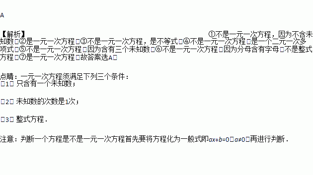 下列各式:①5+2=7;②x=1;③2a<3b;④4x+y;⑤x+y+z=0;⑥x+=1;⑦+1=3x.其中一元一次方程有( )