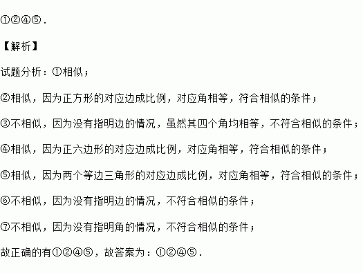 给出下列几何图形:①两个圆;②两个正方形;③两个矩形;④两个正六边形;⑤两个等边三角形;⑥两个直角三角形;⑦两个菱形.其中,一定相似的有_ _(填序号).