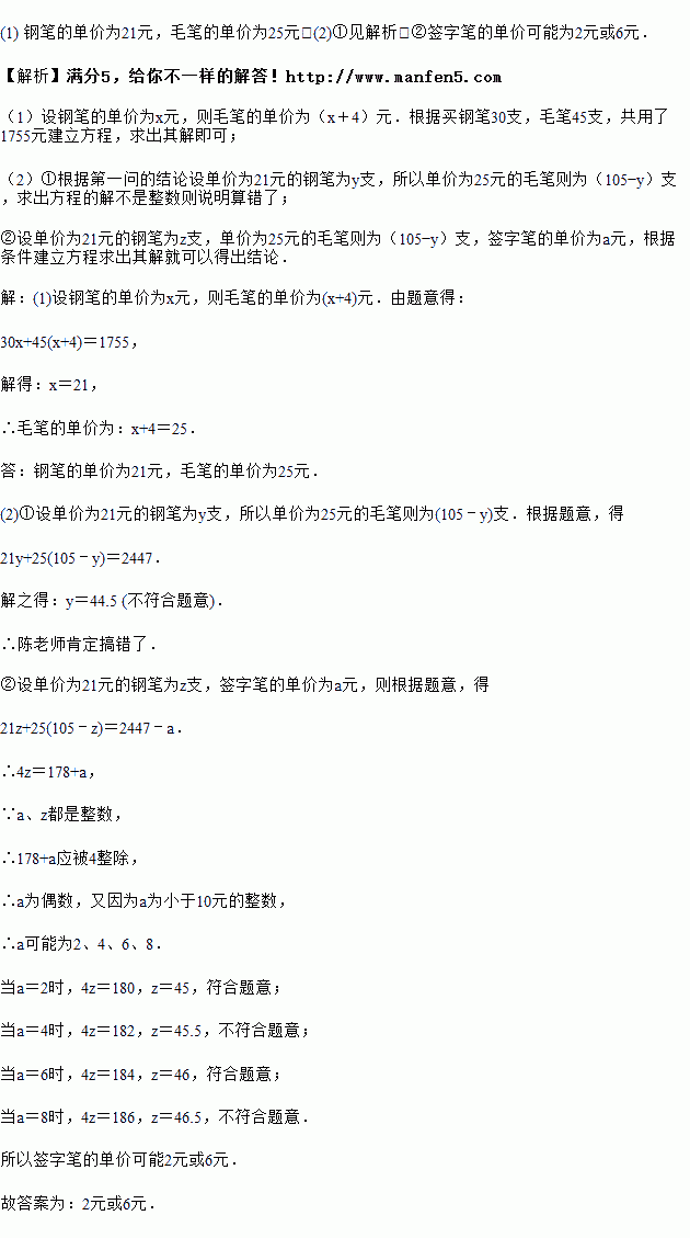 £¨2£©¢ÙѧУÈÔÐèÒª¹ºÂòÉÏÃæµÄÁ½Öֱʹ²105Ö§£¨Ã¿Öֱʵĵ¥¼Û²»±ä£©£®³ÂÀÏʦ×öÍêÔ¤Ëãºó£¬Ïò²ÆÎñ´¦ÍõÀÏʦ˵£º¡°ÎÒÕâ´ÎÂòÕâÁ½ÖÖ±ÊÐèÖ§Áì2447Ôª£®¡±ÍõÀÏʦËãÁËһϣ¬Ëµ£º¡°Èç¹ûÄãÓÃÕâЩǮֻÂòÕâÁ½Öֱʣ¬ÄÇôÕʿ϶¨Ëã´íÁË£®¡±ÇëÄãÓÃѧ¹ýµÄ·½³Ì֪ʶ½âÊÍÍõÀÏʦΪʲô˵ËûÓÃÕâЩǮֻÂòÕâÁ½ÖֱʵÄÕÊËã´íÁË£®