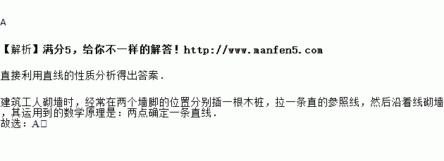建筑工人砌墙时,经常在两个墙脚的位置分别插一根木桩,拉一条直的参照线,然后沿着线砌墙,其运用到的数学原理是( )