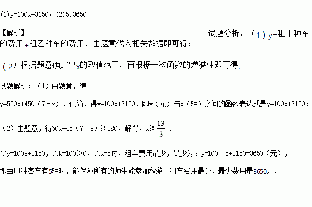 (1)设租用甲种客车x辆,租车总费用为y元.求出y(元)与x(辆)之间的函数表达式;
