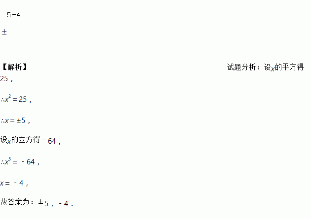 平方得25的数是_____,立方得﹣64的数是_____.
