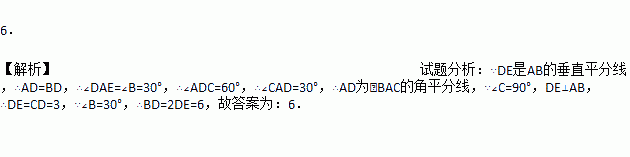 如图,在△ABC中,∠C=90°,∠B=30°,边AB的垂直平分线DE交AB于点E,交BC于点D,CD=3,则BC的长为 ( )
