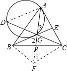 分析:构造以重心G为顶点的平行四边形GBFC,并巧用A、D、F、C四点共圆巧证乘积.延长GP至F,使PF=PG,连接FB、FC、AD.因G是重心,故AG=2GP.因GBFC是平行四边形,故GF=2GP.从而AG=GF.又∠1=∠2=∠3=∠D,故A、D、F、C四点共圆,从而GA、GF=GC•GD.于是GA2=GC•GD.
