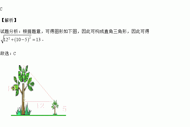 如图,有两颗树,一颗高10米,另一颗高5米,两树相距12米.一只鸟从一颗树的树梢飞到另一颗树的树梢,问小鸟至少飞行( )