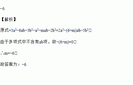 若关于a,b的多项式3(a2-2ab-b2)-(a2+mab+2b2)中不含有ab项,则m=________.