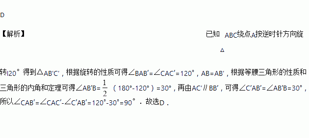 如图,△ABC为钝角三角形,将△ABC绕点A按逆时针方向旋转l20°得到△AB′C′,连接 BB′,若AC′∥BB′,则∠CAB′的度数为( )